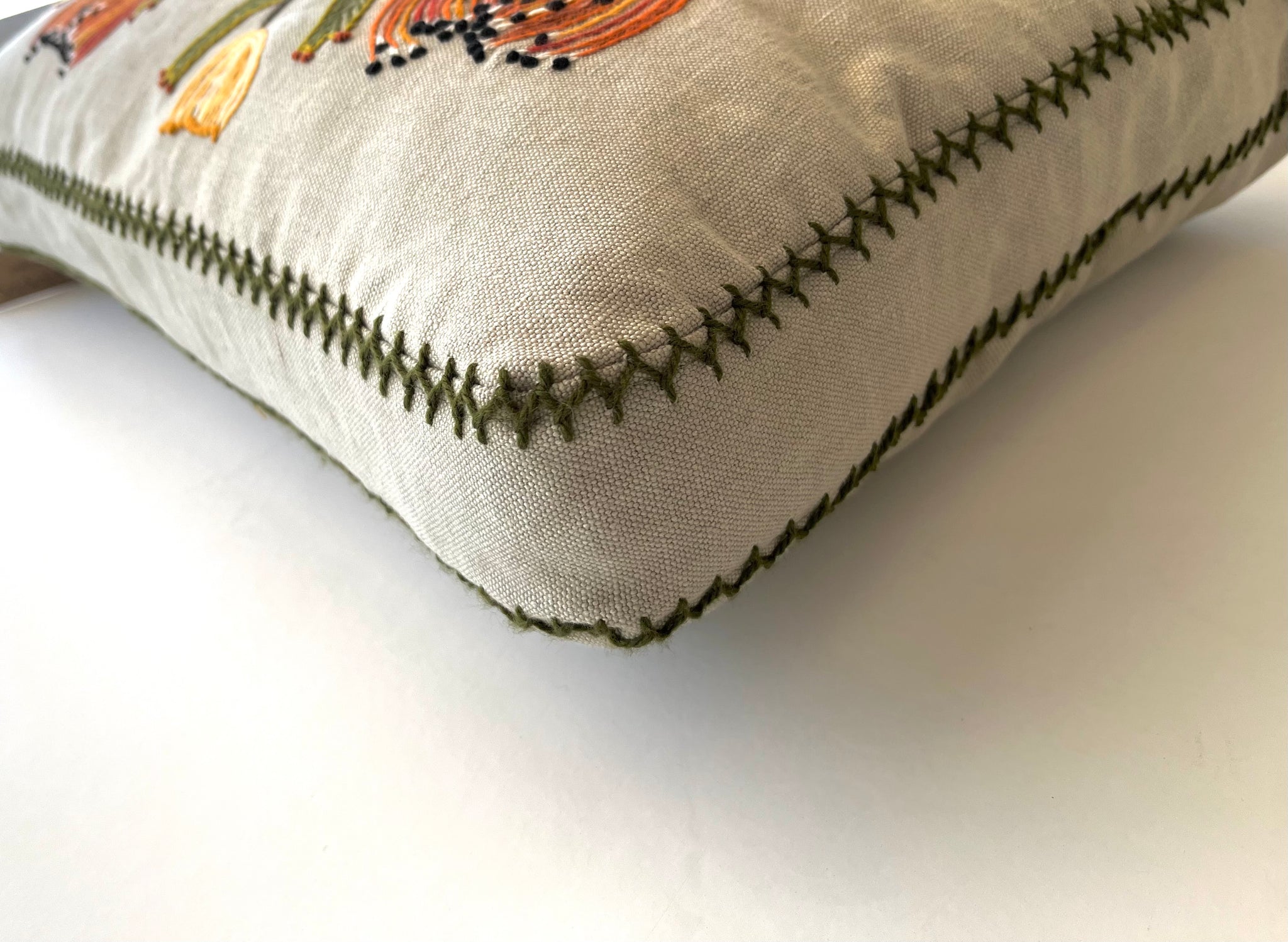 Box cushion with gusset, hand embroidered in bamboo and cotton yarns.