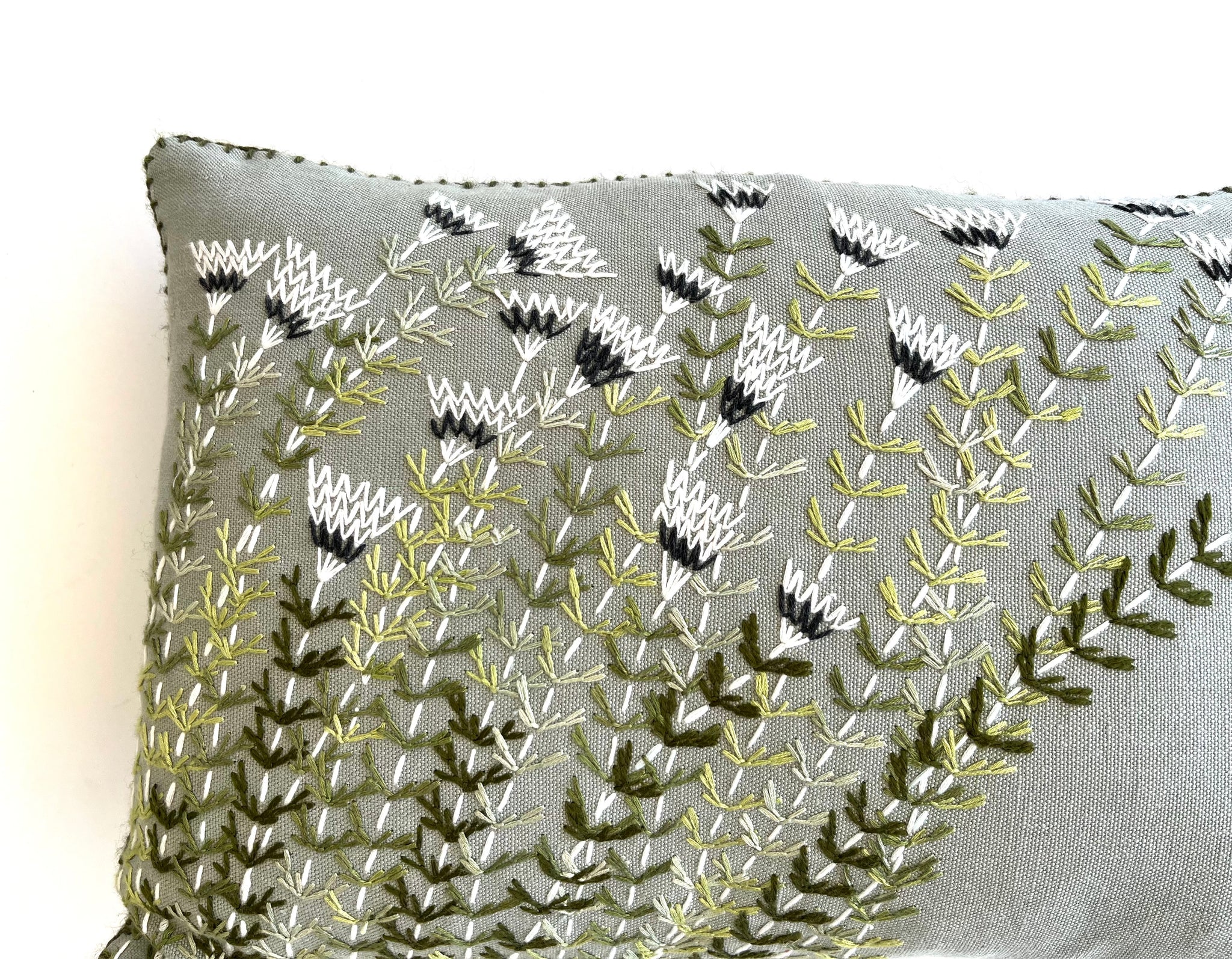 Scatter cushion hand embroidered in bamboo and cotton yarns.