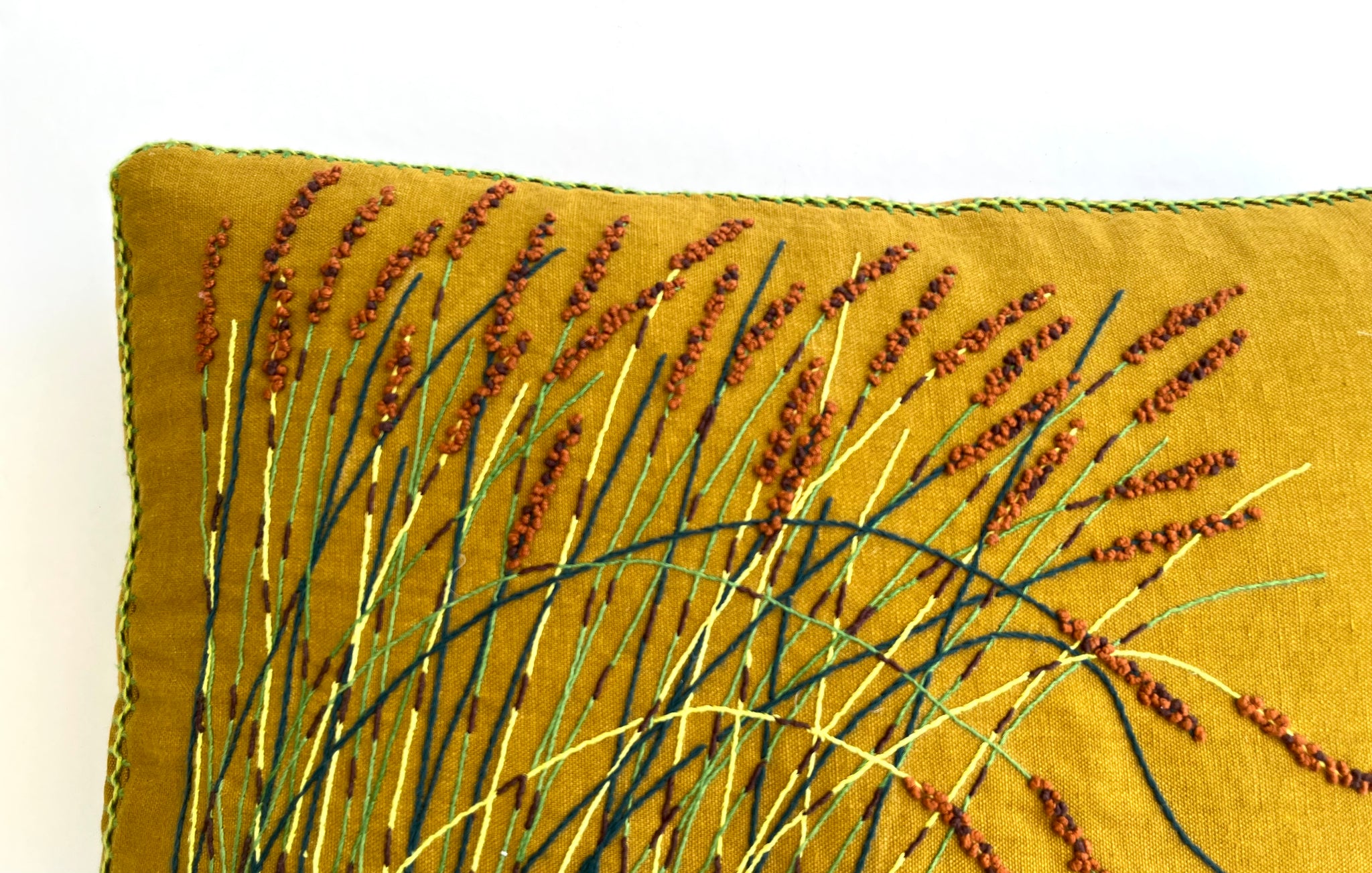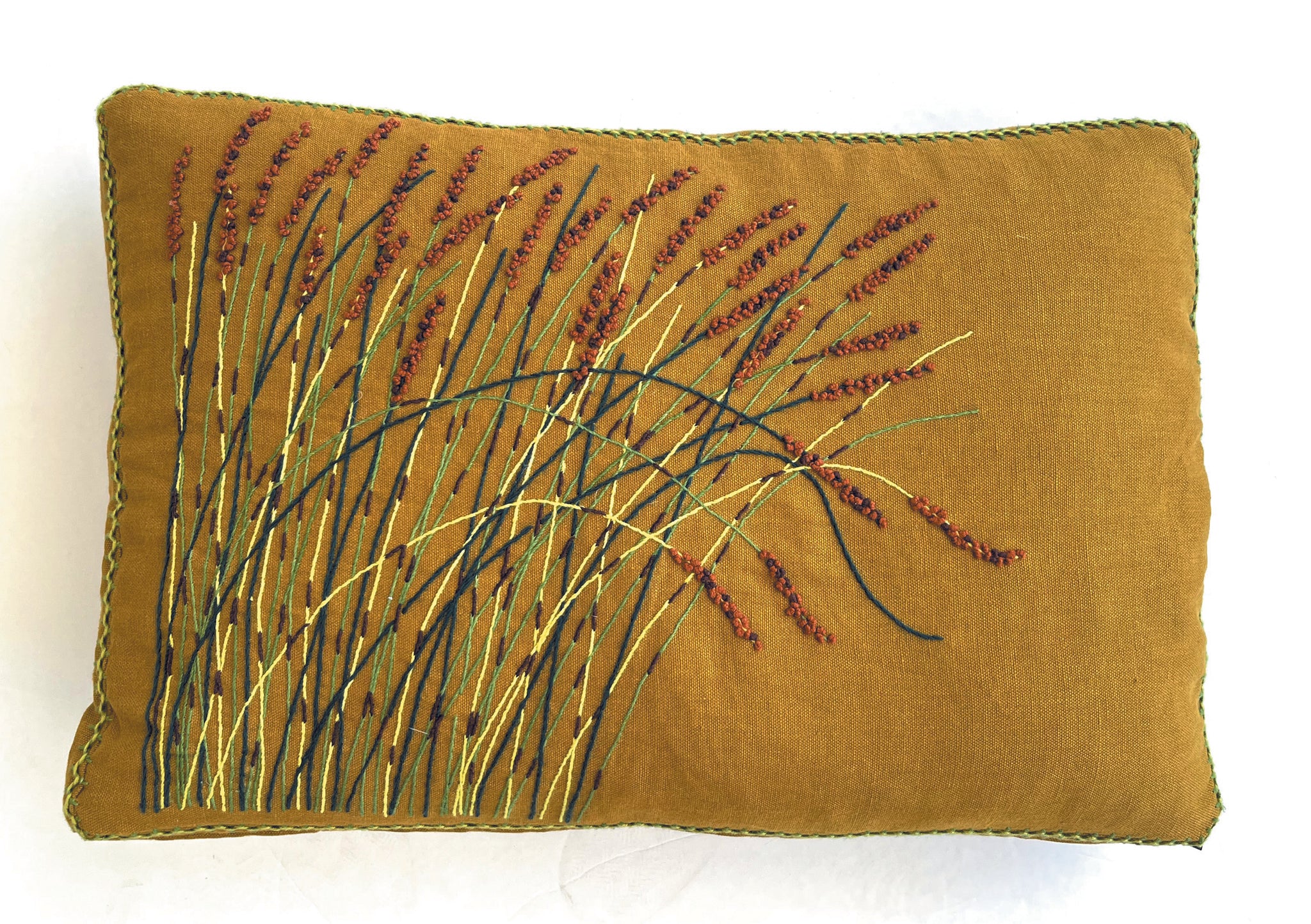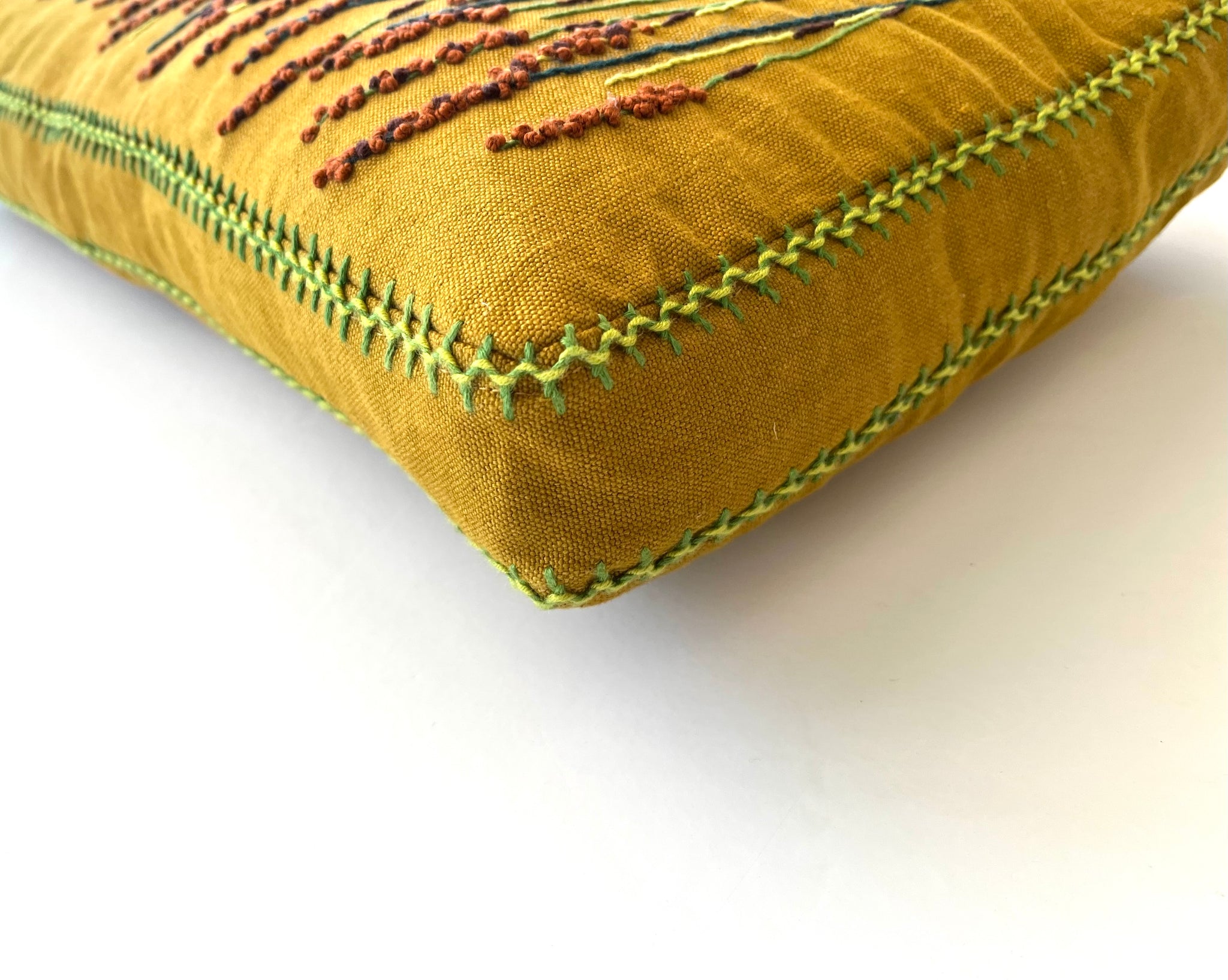 Box cushion with gusset, hand embroidered in bamboo and cotton yarns.