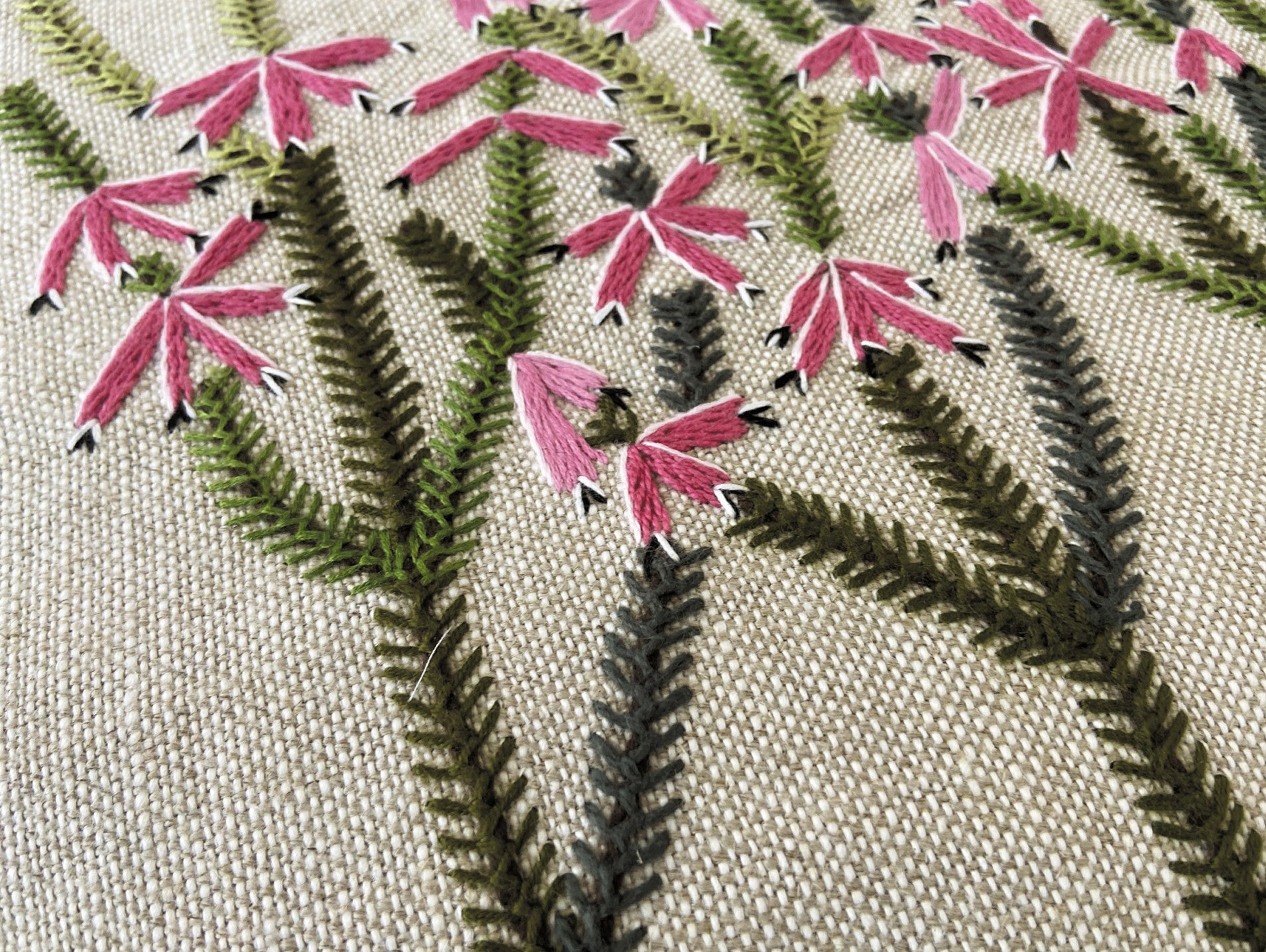 Box cushion with gusset, hand embroidered in bamboo and cotton yarns.